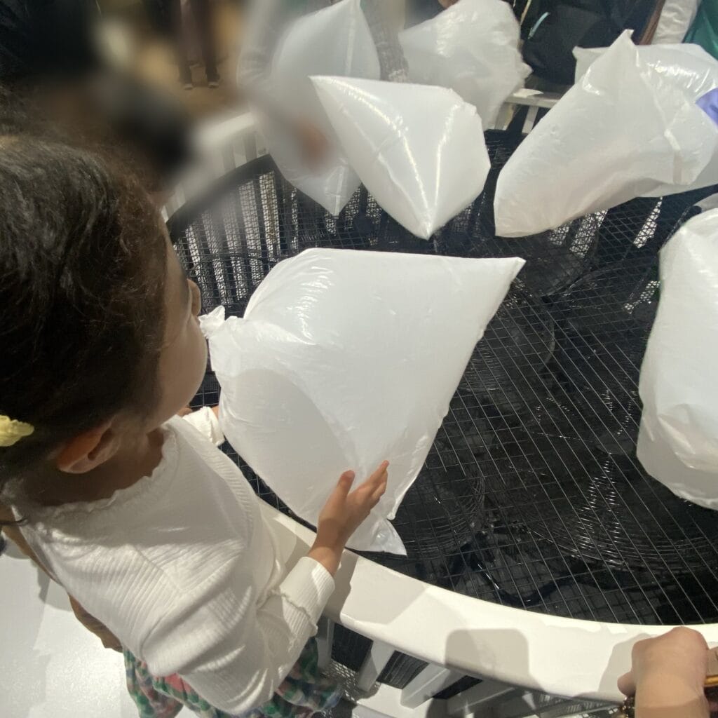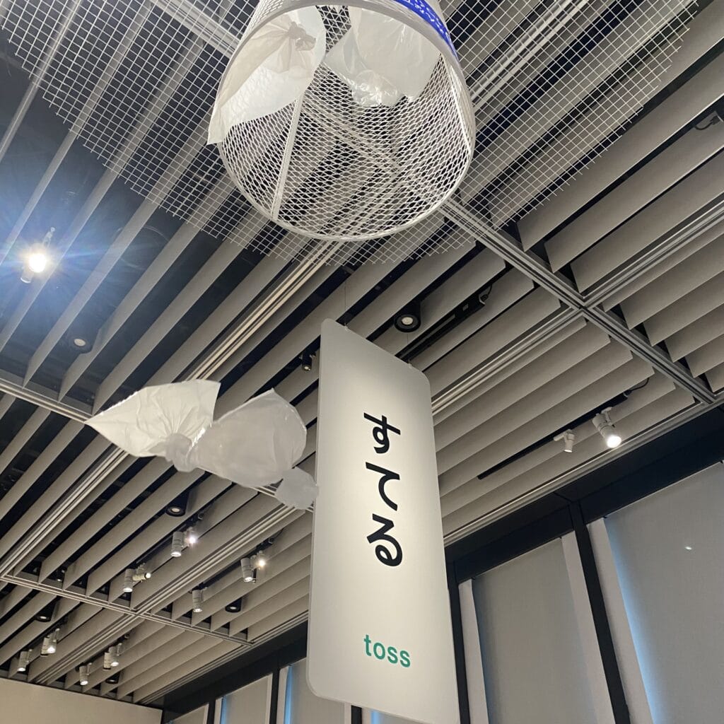 この展示は、大きな空気口のようなものが設置されていて、そこにゴミ袋をかざすと風によって上に吹き上げられる仕組みになっています。そのゴミ袋を、天井に吊り下げられているゴミ箱に入れることができるか?!というゲームのようなものでした。