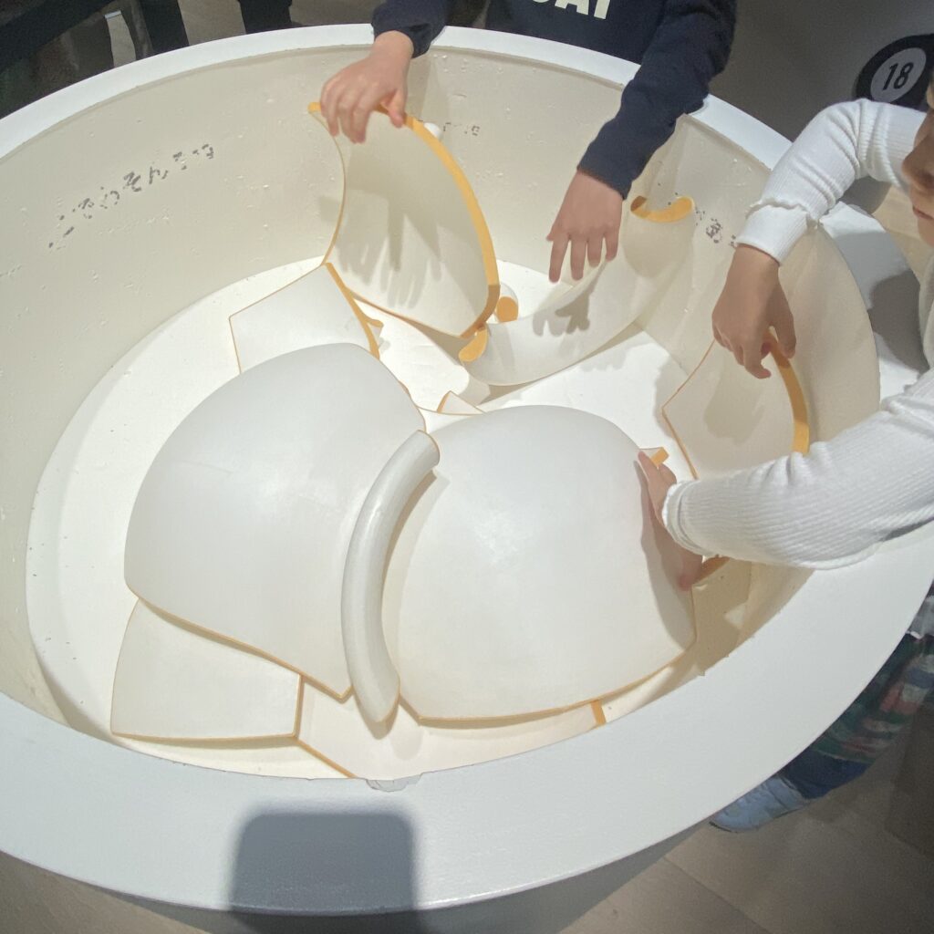 想像以上に時間がかかりながら家族4人でなんとか完成させたものの、最後はこれを枠内に落とし、壊して終わり。(ただタイトルから思うに、もしかしたら本来の体験としては「(完成形を)こわす→なおす」の順番なのかも…?)