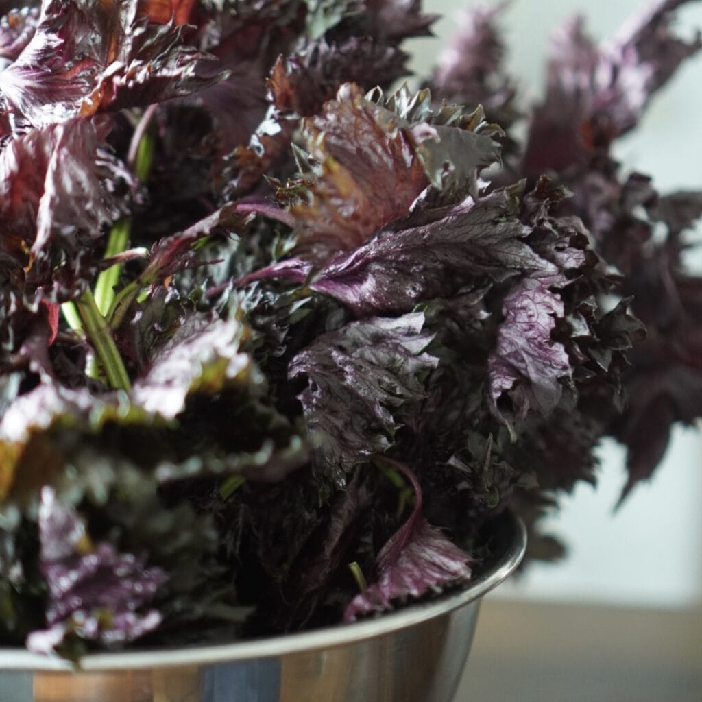 定期的にのぞいている地元の産直で、きれいな紫色の紫蘇の葉っぱを見つけました。