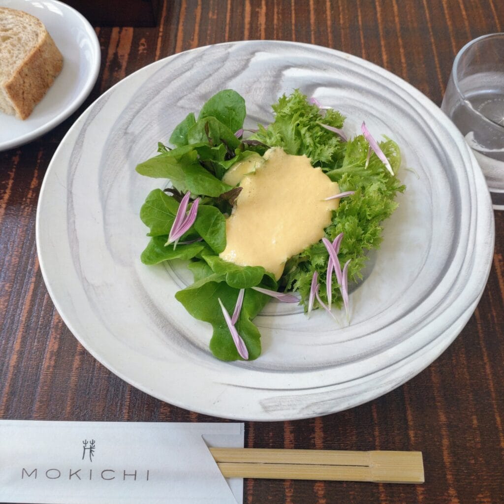 マンゴードレッシングのサラダ。珍しい。ほんのりマンゴーの甘みがあって、クリーミーなドレッシングです。
