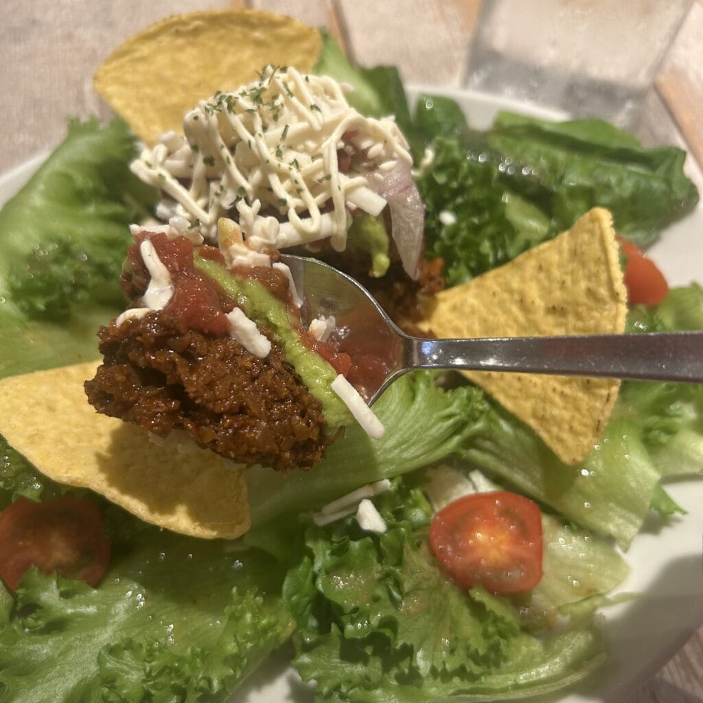 ベジタブルミートが本物のひき肉のようで、ヴィーガン料理だと言われなければ気がつかないかもしれません。