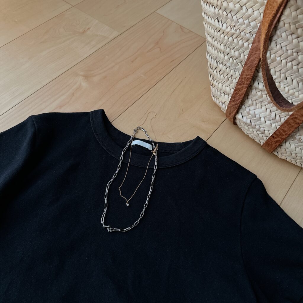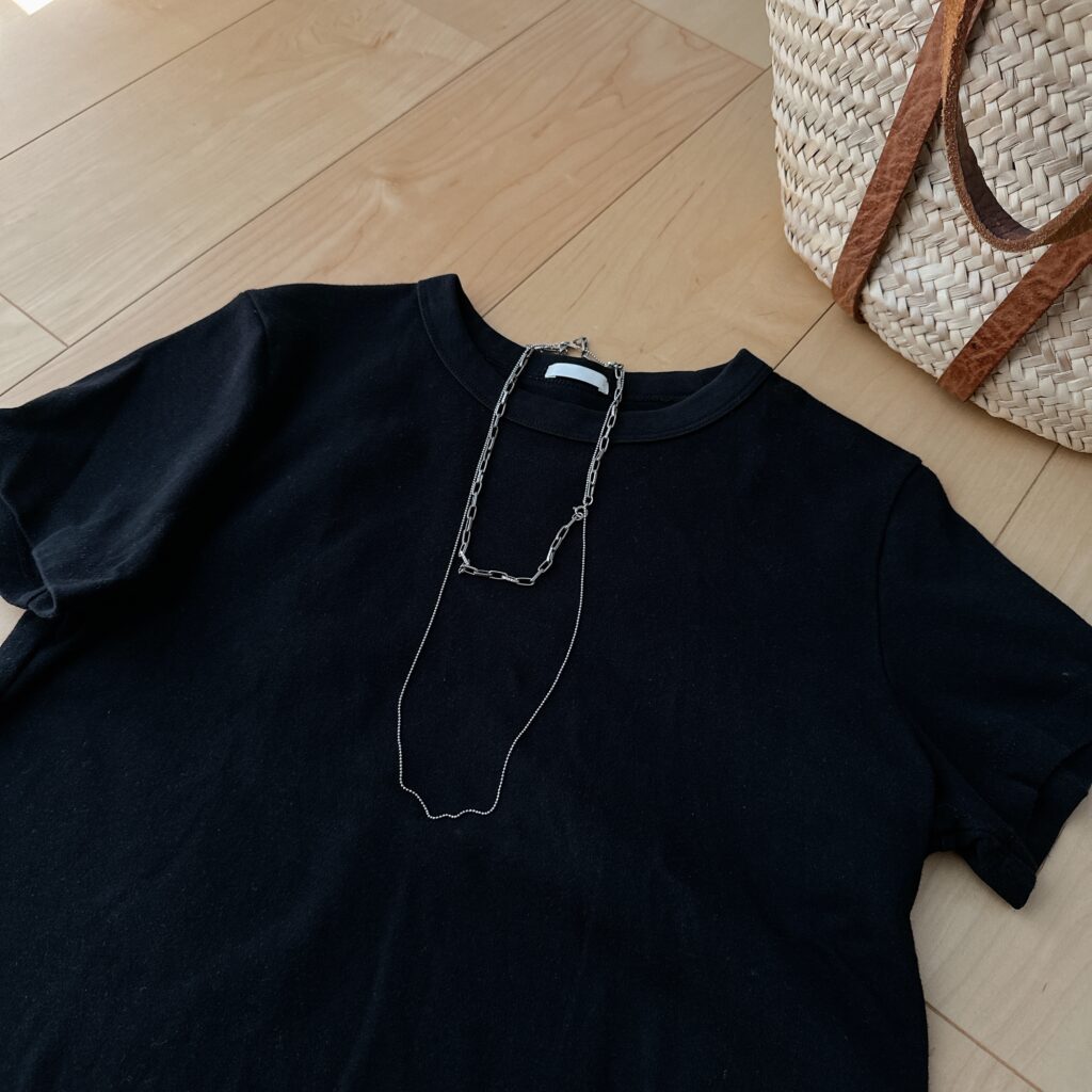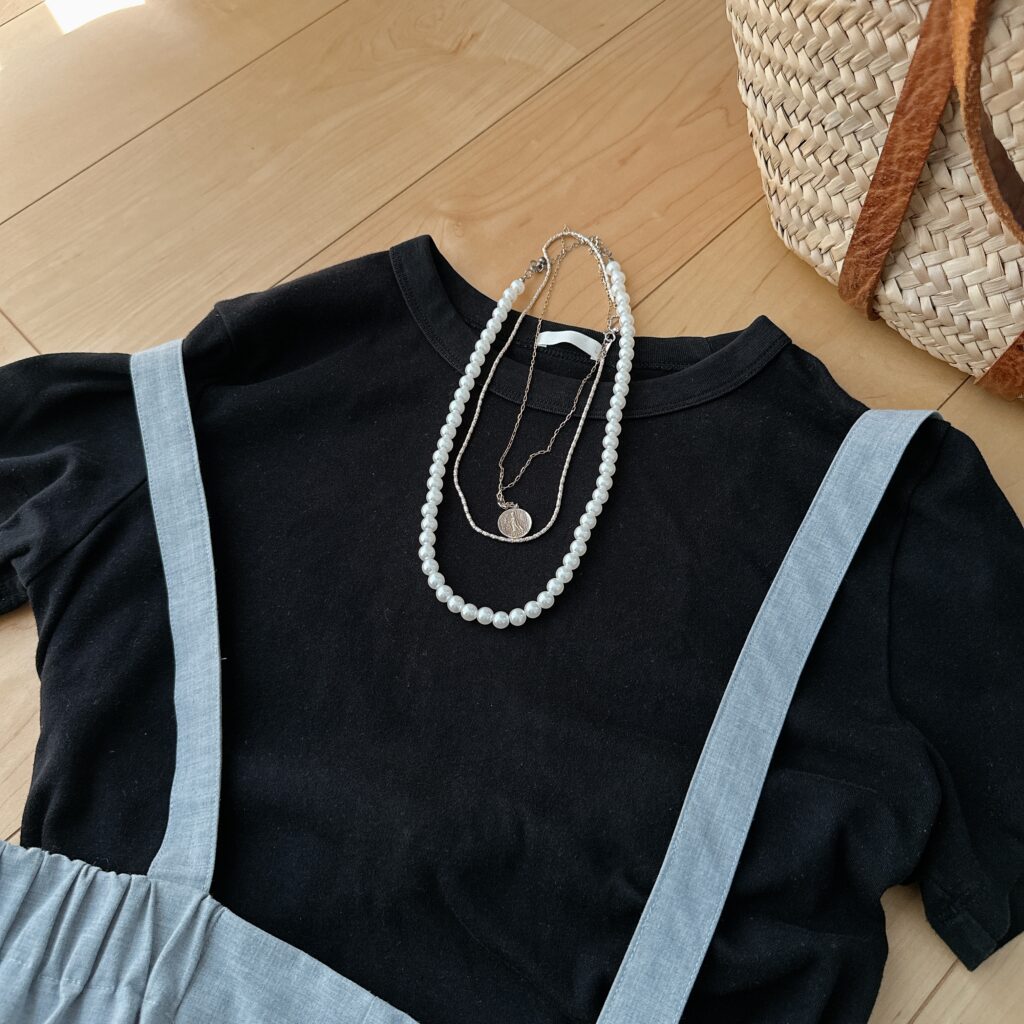 黒T+デニムは、ザ★カジュアル!ザ★シンプル!な組み合わせですが、パールネックレスとコインレックレスを合わせることで、お上品さが足された気がします!