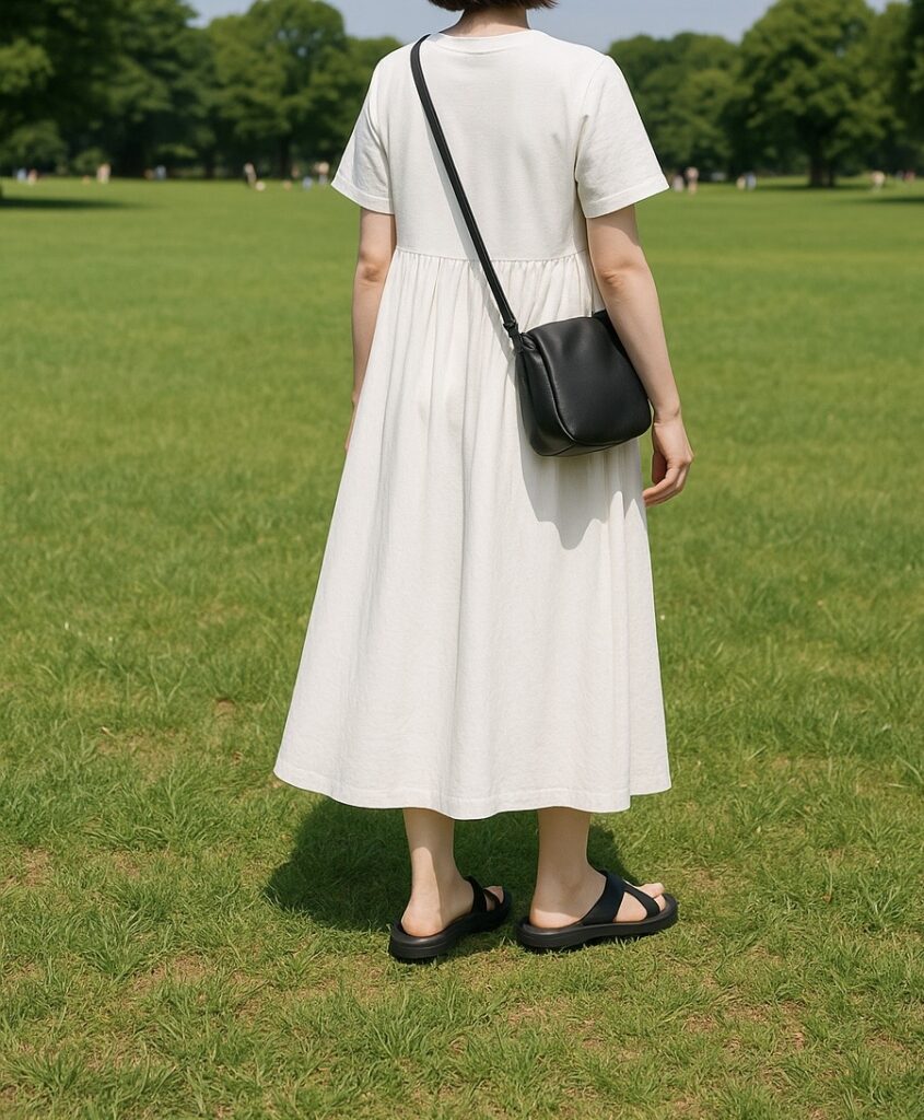 あえての白ワンピで涼しげに、黒のアイテムで引き締めます!
