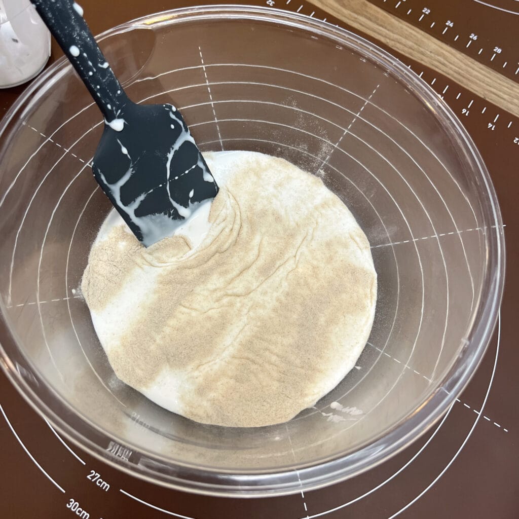 ここに、メープルや塩、イーストなどの材料を追加して、ミキサーにかけます。