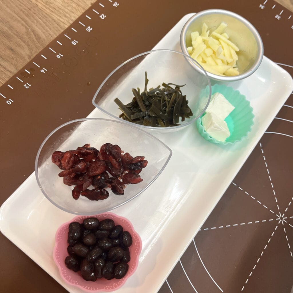 丸く丸めた生地の中に、好みの具材を乗せていきます。