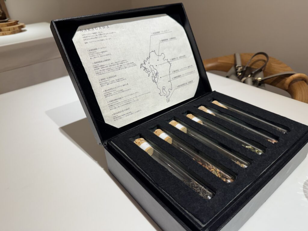 最後の飲み物を選ぶ際、スタッフの方がこちらの黒い箱を持ってきて、開けると試験管に九州各地の紅茶のサンプルが…。こういうの面白いですよね。
