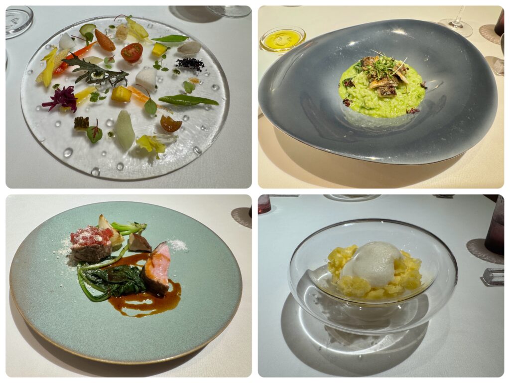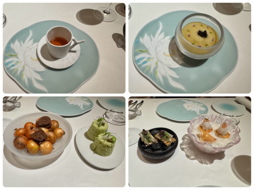 その後に、ミョウガや魚の上にナスのスープとキャビアが乗った料理(右上)が出ました。これは夫がすごく気に入っていました。和食のような感覚でした。