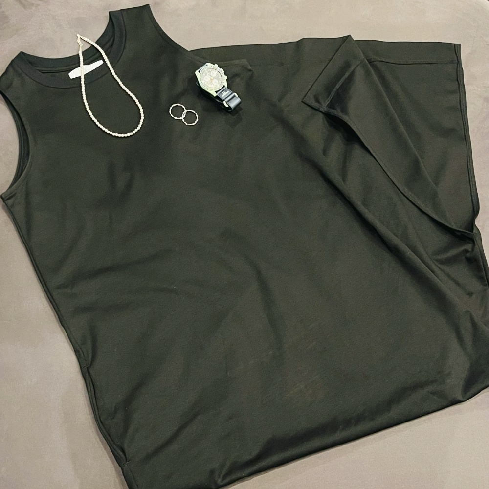 シンプルなデザイン&シルエット、つるっとした表面感でほどよい厚みのポンチ素材、など一枚で着ても重ね着をしても着まわせる工夫がいっぱいのこちらのワンピ。