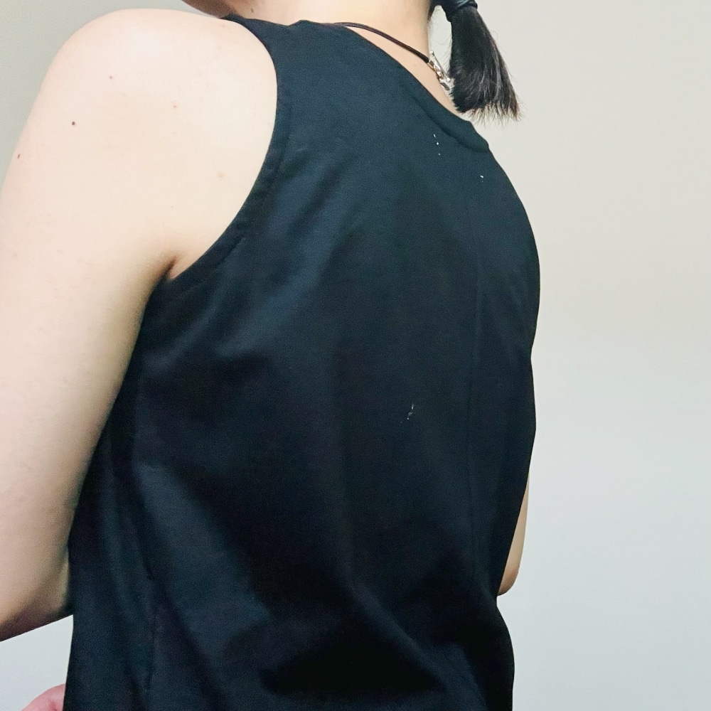 とはいえ、肩周りの幅が狭いアメスリは、肌が出る面積が多いのでちょっと勇気が必要だったり、インナーに気を遣うなと思っていました。