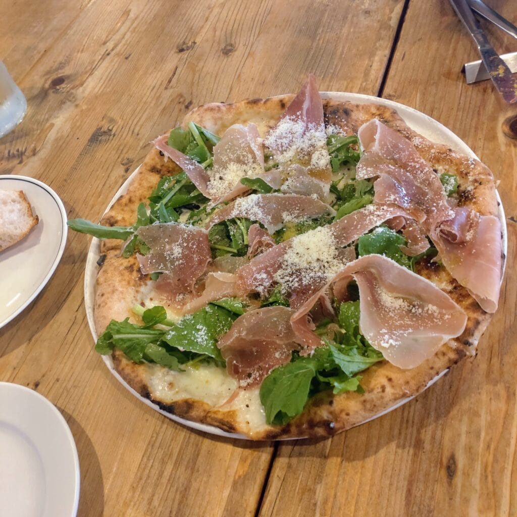生ハムとルッコラのピザ。ピザは店員さんに相談しました。サービスも対応も良くて気持ちよくお食事ができました。