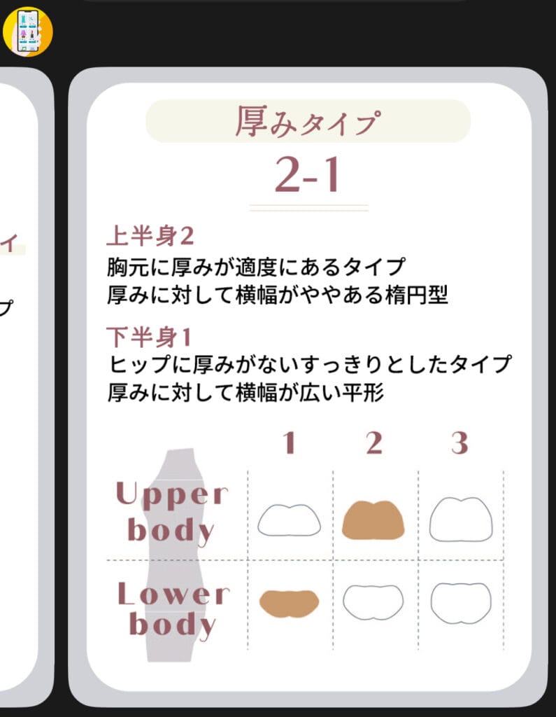 最近流行りの骨格診断では、ストレート・ウェーブ・ナチュラルと3タイプに分類されますが、こちらの診断はそれとは別で、身体の肉付きなども考慮して、36種類ものタイプに分かれるそうです。