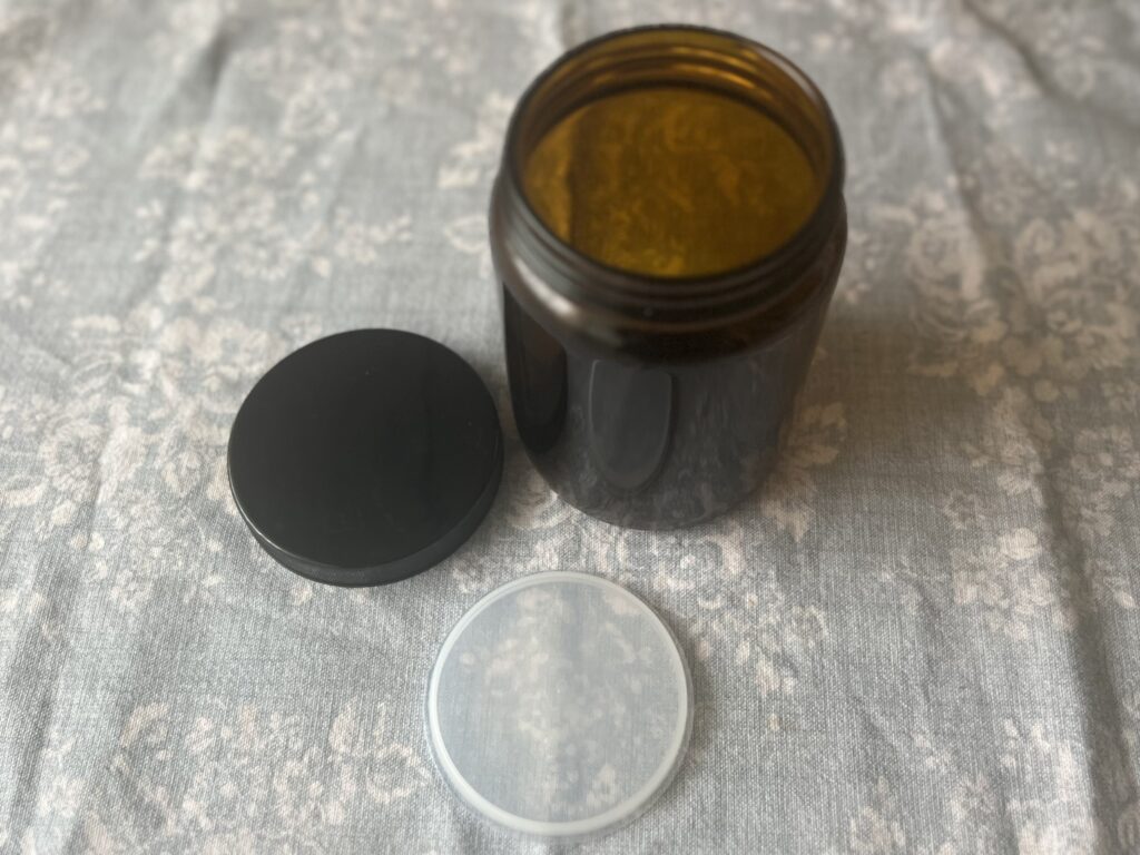 蓋と瓶の間に密閉性を高める中蓋が付いたタイプを選びました。ちなみに日本製。さすが、日本製の瓶の造りは本当にしっかりしています。