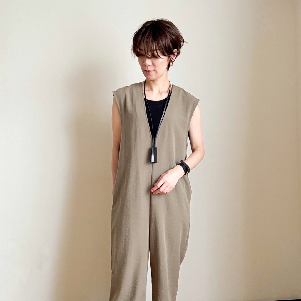 シンプルなオールインワン。アクセサリーを足すことでクールさが出ます。アクセサリーは金具がゴールドなので、イヤアクセなどもゴールドに揃えてつけています。