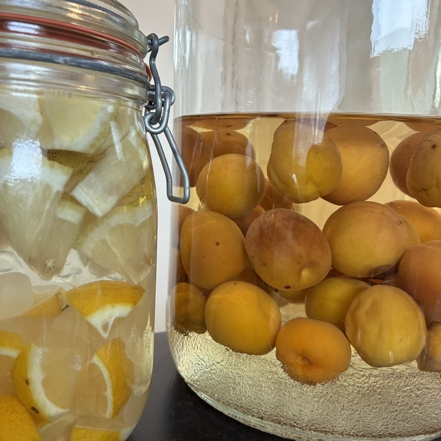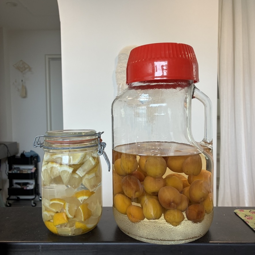 右は6月中旬ごろに作った梅酒。1日に1回ゆっくり瓶を回しています。