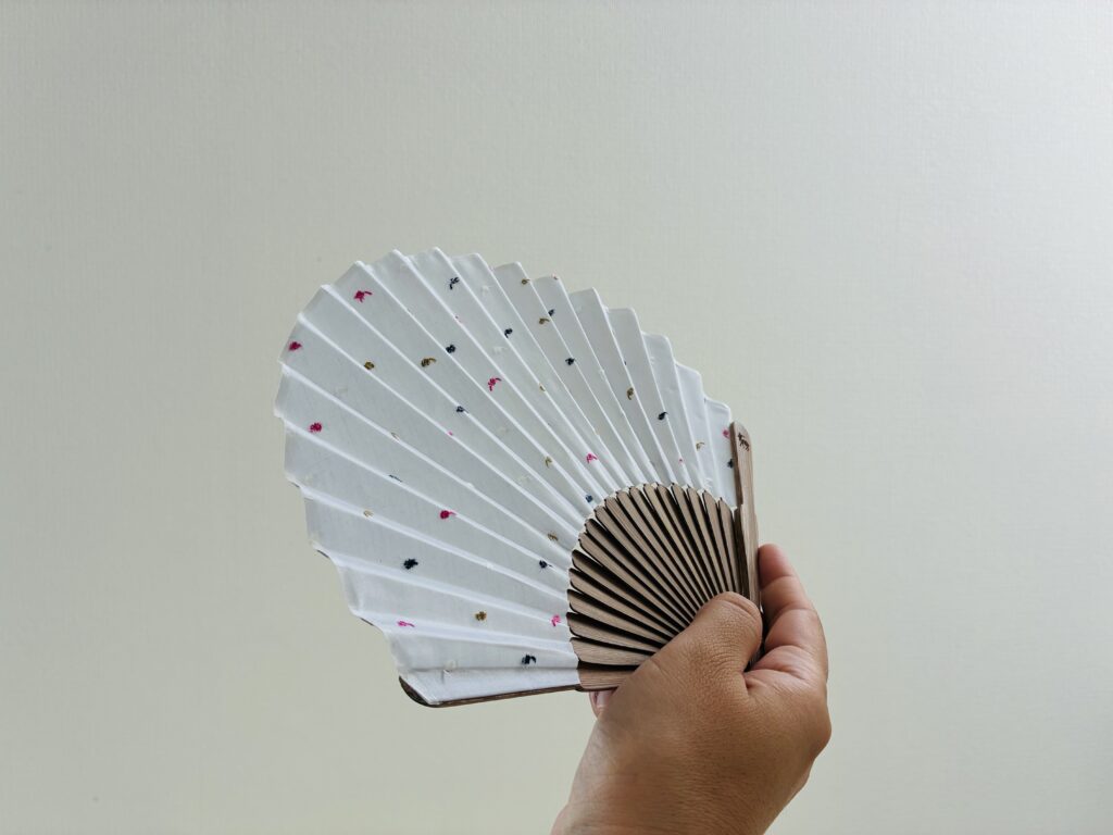 可愛いだけじゃなくて、扇ぐときに無駄なく風が来る気がしています。それから扇形と違って端っこが当たらないのも良い。