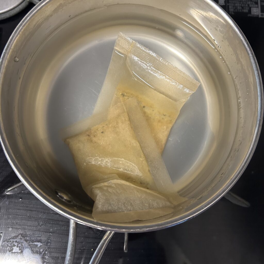 だしパック2つを800mlの水に入れ…塩を少々。これだけでスープの出来上がり!
