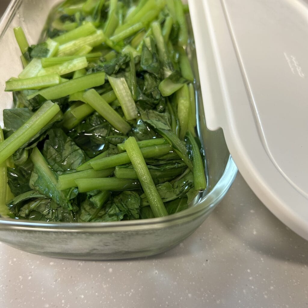 トッピングは、最近ハマりにハマって週1どころか2、作っている長谷川あかりさんの『小松菜の塩おひたし』。