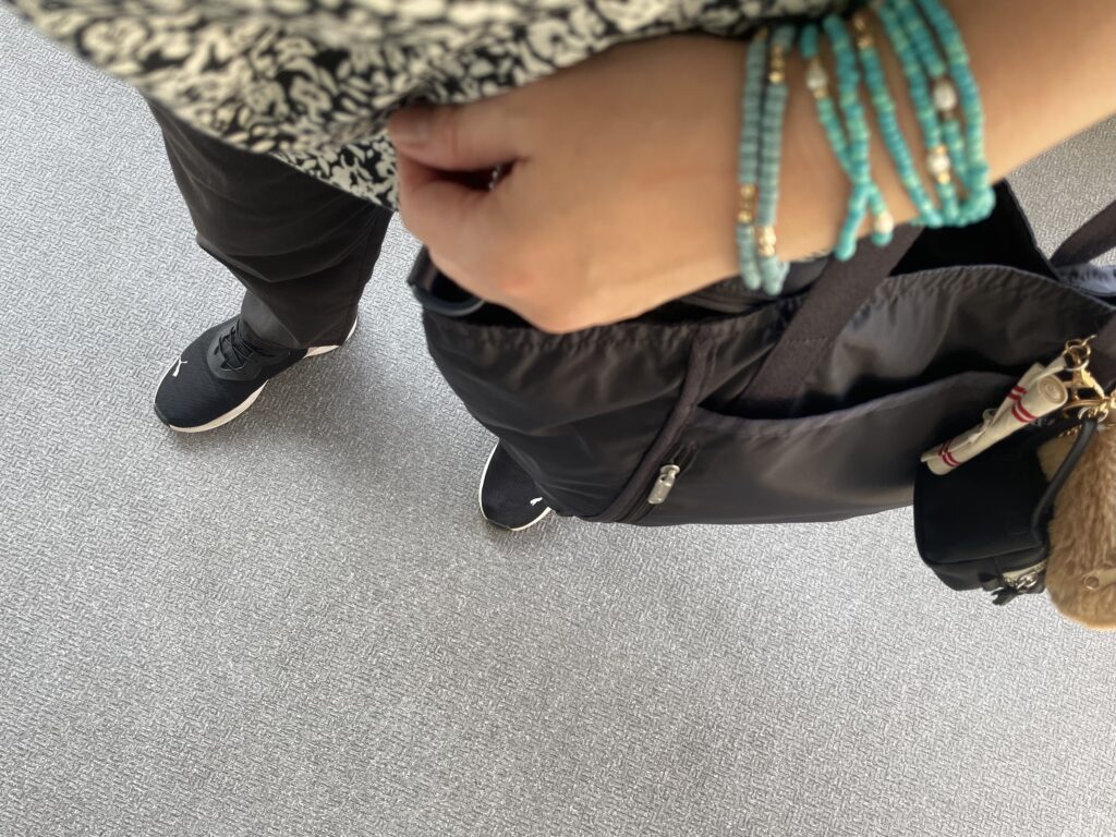 腕にはいつかのGUのブレスレットに、同じくGUのネックレスを2本繋げて腕にグルグル巻き付けています。
