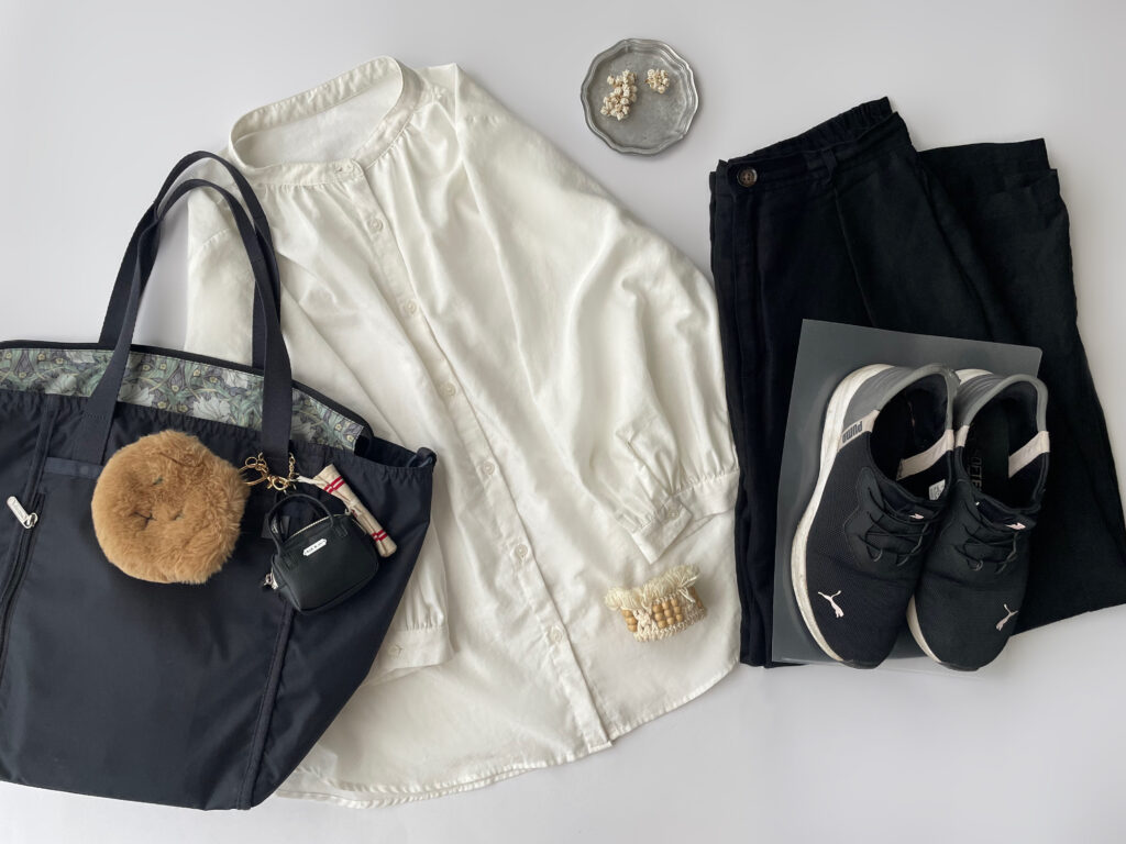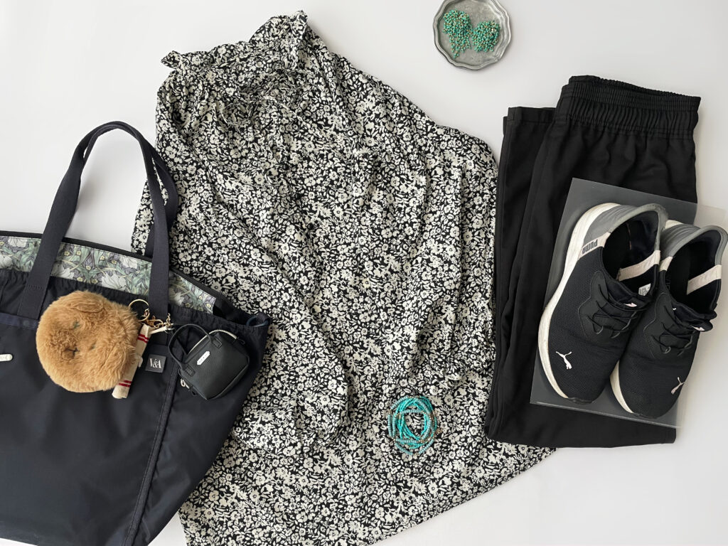 出社DAY。いつかのGUの小花柄ペザントブラウスにGUの黒のシェフパンツを合わせています。
