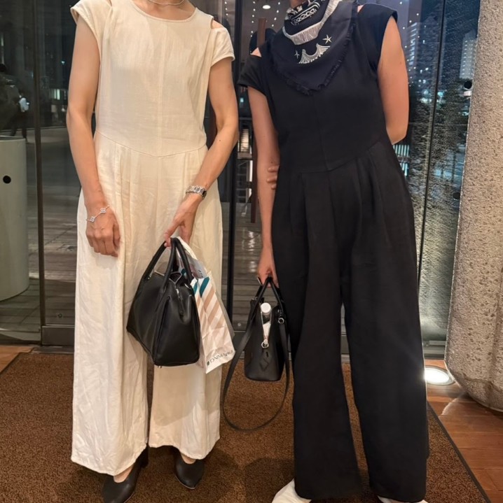 ある日の装いは、デザイナーの友達とバレエの発表会を観に行ったときのもの。たまたま会場に着くと白と黒で笑いました。スカーフ使いが素敵で、私も真似してみたくなりました。