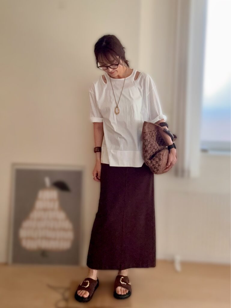 スカートのこっくり赤みブラウンとサンダルの色味がすごく合っていて、コーデを組んでひとりガッツポーズ。