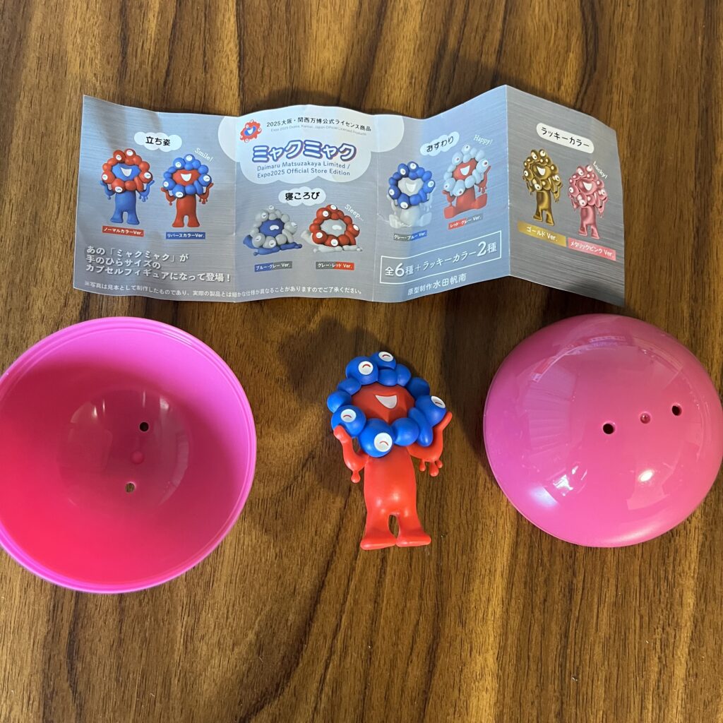 他にも、ミャクミャクが輪になったステッカーや、ミャクミャクが「イエーイ!」と飛び出しているイラストのマグネット、見つけて握りしめていた海洋堂カプセル。どれもお気に入りのようで、満足気な表情で眺める姿をみると、「ちょっと買いすぎたな…」と思う気持ちも吹き飛びました♡