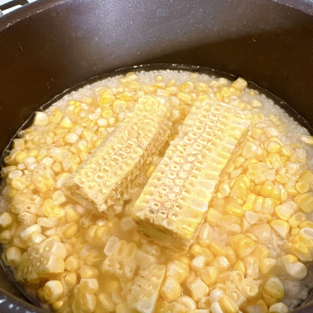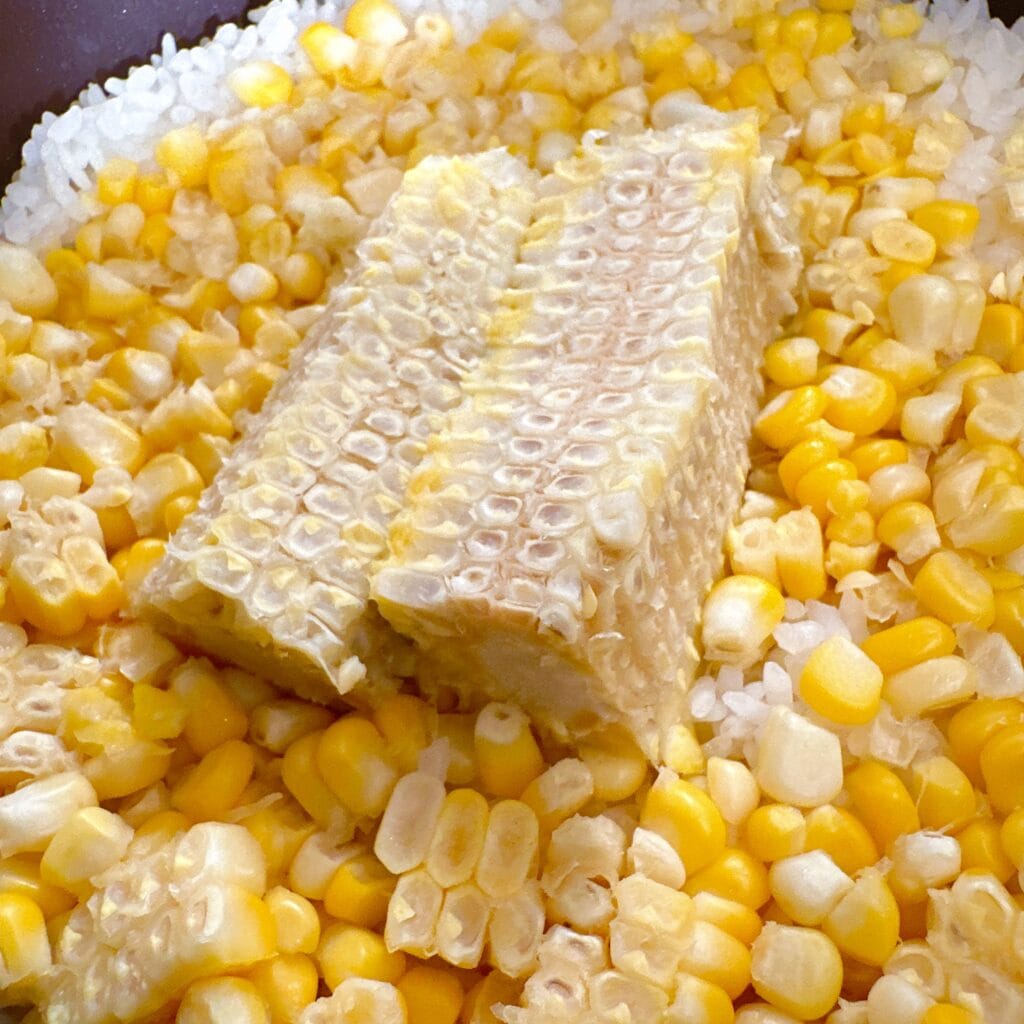 お酒と昆布を入れてお米2合を浸水させ、芯を削ぎ落とした生のとうもろこしを、塩麹と一緒に炊飯するだけ!