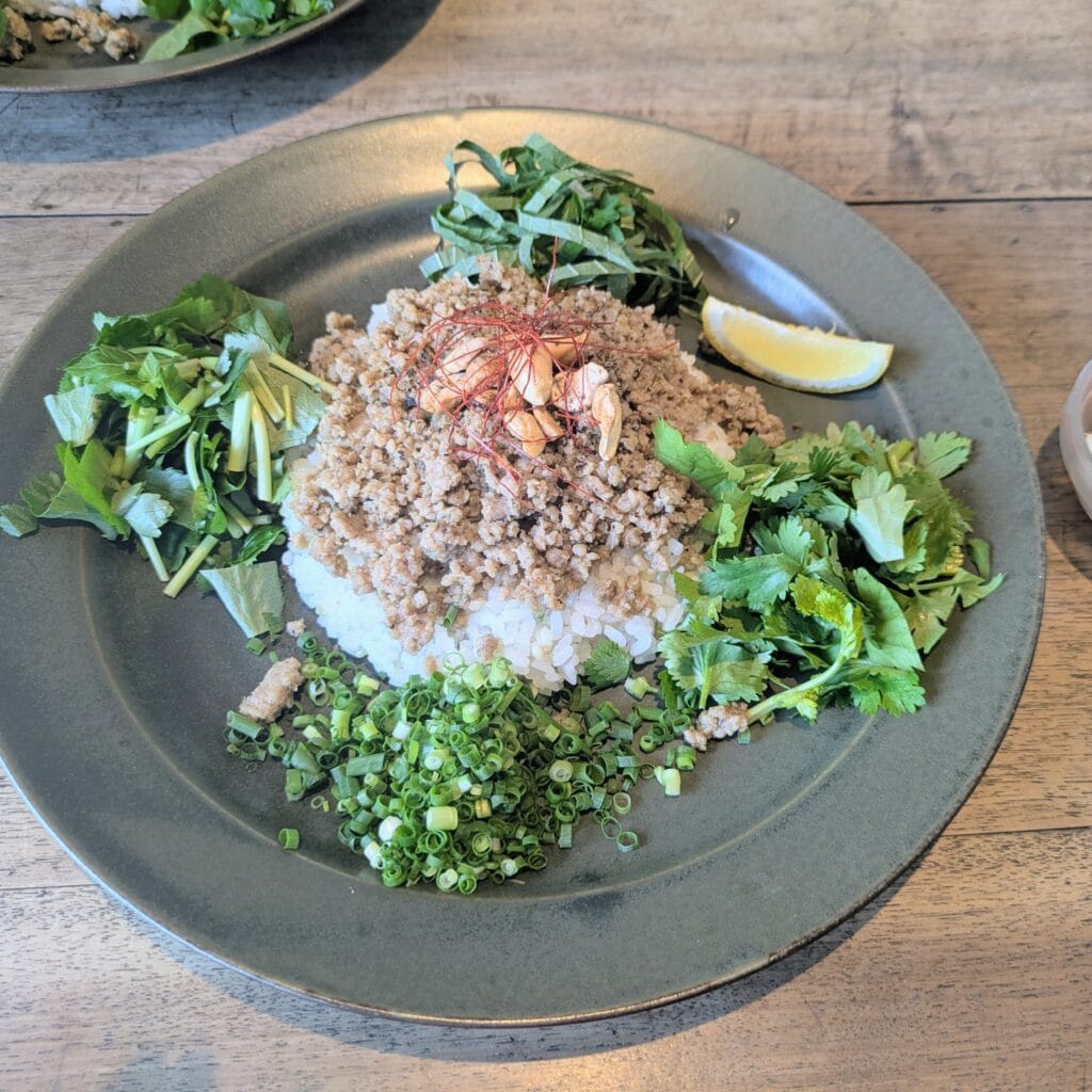 窓から光が差し込む店内はとっても素敵な雰囲気。私はそぼろカリーを注文。ピリ辛のそぼろと、添えられた香草や薬味が絶妙なバランスで、一口食べるごとに色々な味が楽しめます。