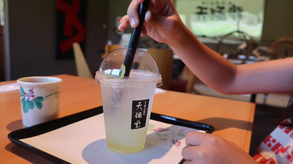 娘はくず餅サイダーのレモンを。ぷるぷるの砕いたくず餅とレモンのシロップが入った爽やかなサイダーです。