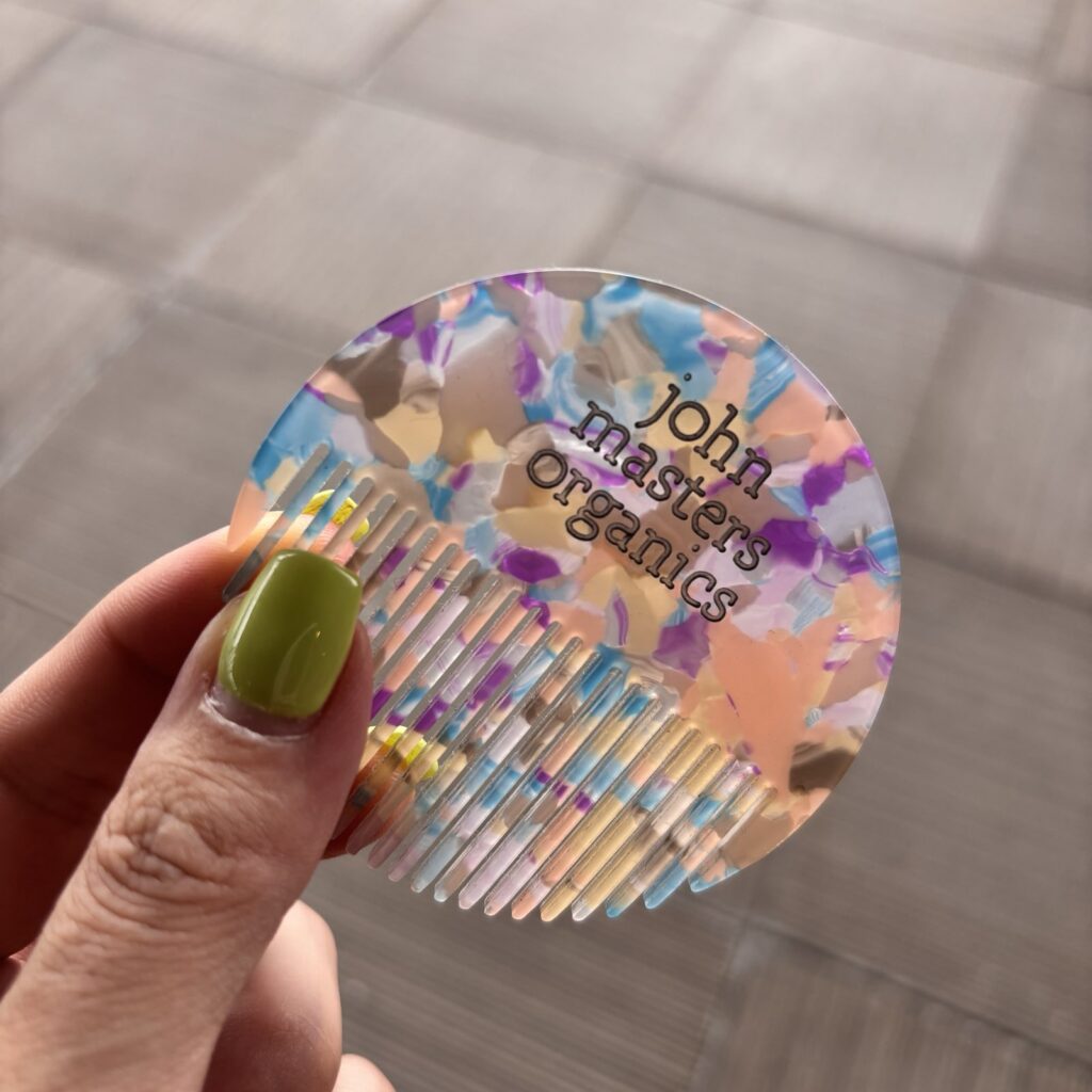 持ち物で取るに足らない、でもちゃんとテンション上げを。そんなアイテムをもらいました。(もらっておきながら、取るに足らないとか言ってはいけませんね。(笑)つまりは、、人からわかる程のテンション上げではないけれど、些細な、でもちゃんと見ると「楽しい」櫛。バッグを小さくして、ポーチも小さくしたので、コレが前髪サササと直したり、湿気であららとなった髪型を整えたりに。香りではなく、視覚で自分をアゲル系のバッグの中身です。痛くない、ちゃんととける、櫛なんですよ。