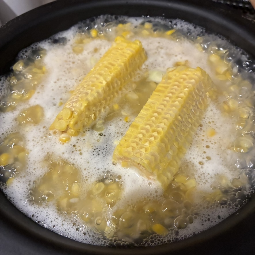 鍋にコーンととうもろこしの芯を入れて、火にかけます。