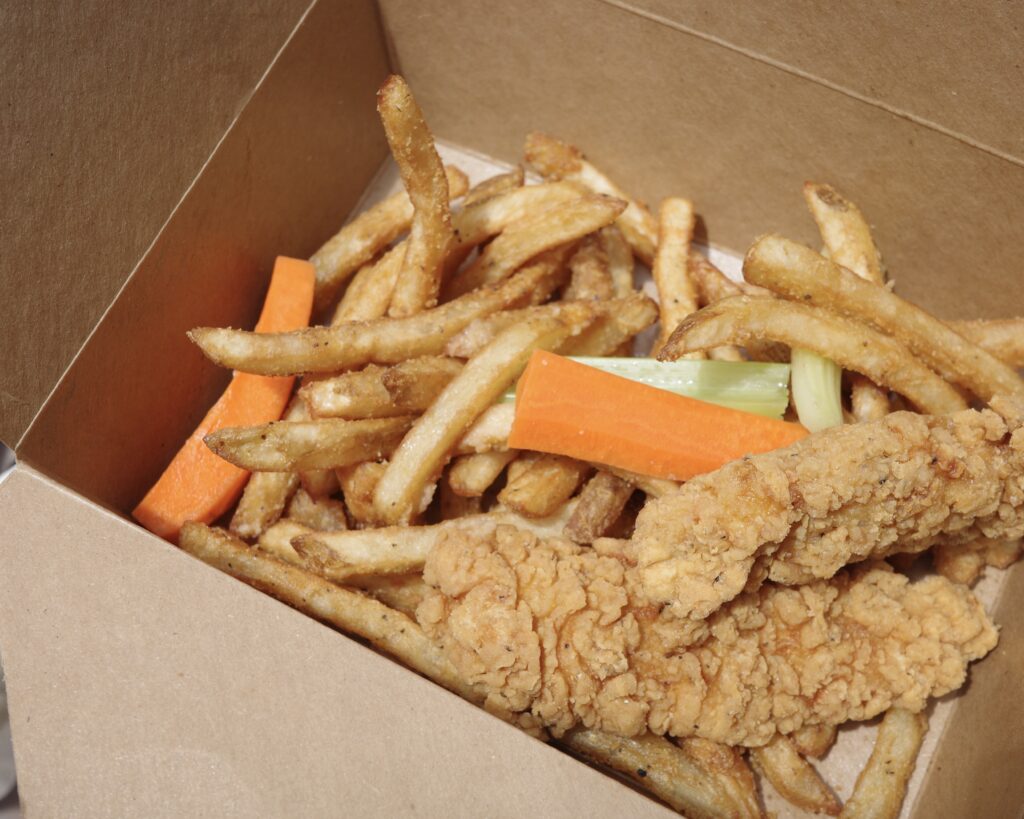 フライドキチンとポテトに野菜スティックが入ったなんだか面白い組み合わせ🍗