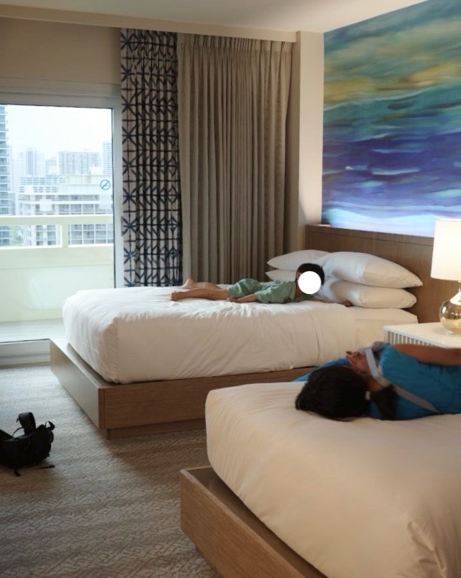 チェックインと同時にベッドに直行する子ども2名!