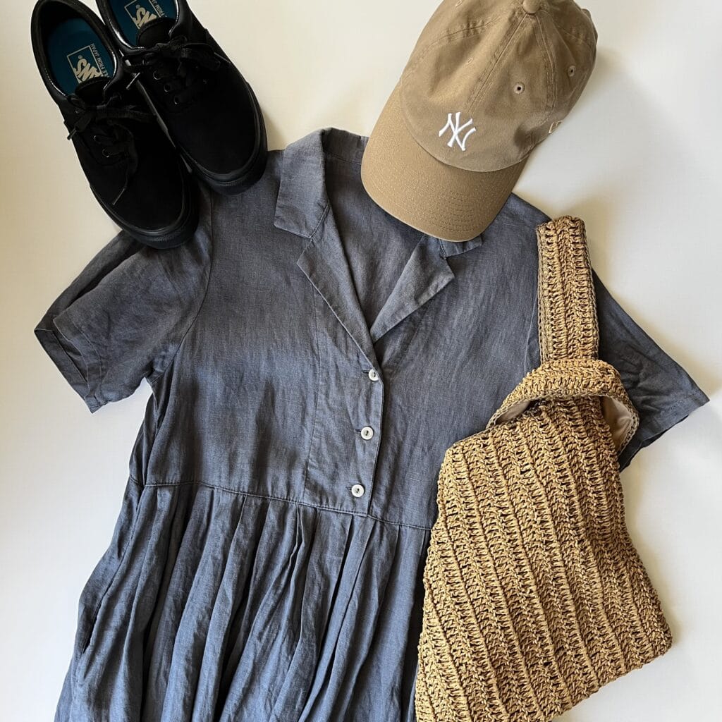きれいめなワンピースをスニーカーとキャップでちょっとカジュアルにはずしてみたり。