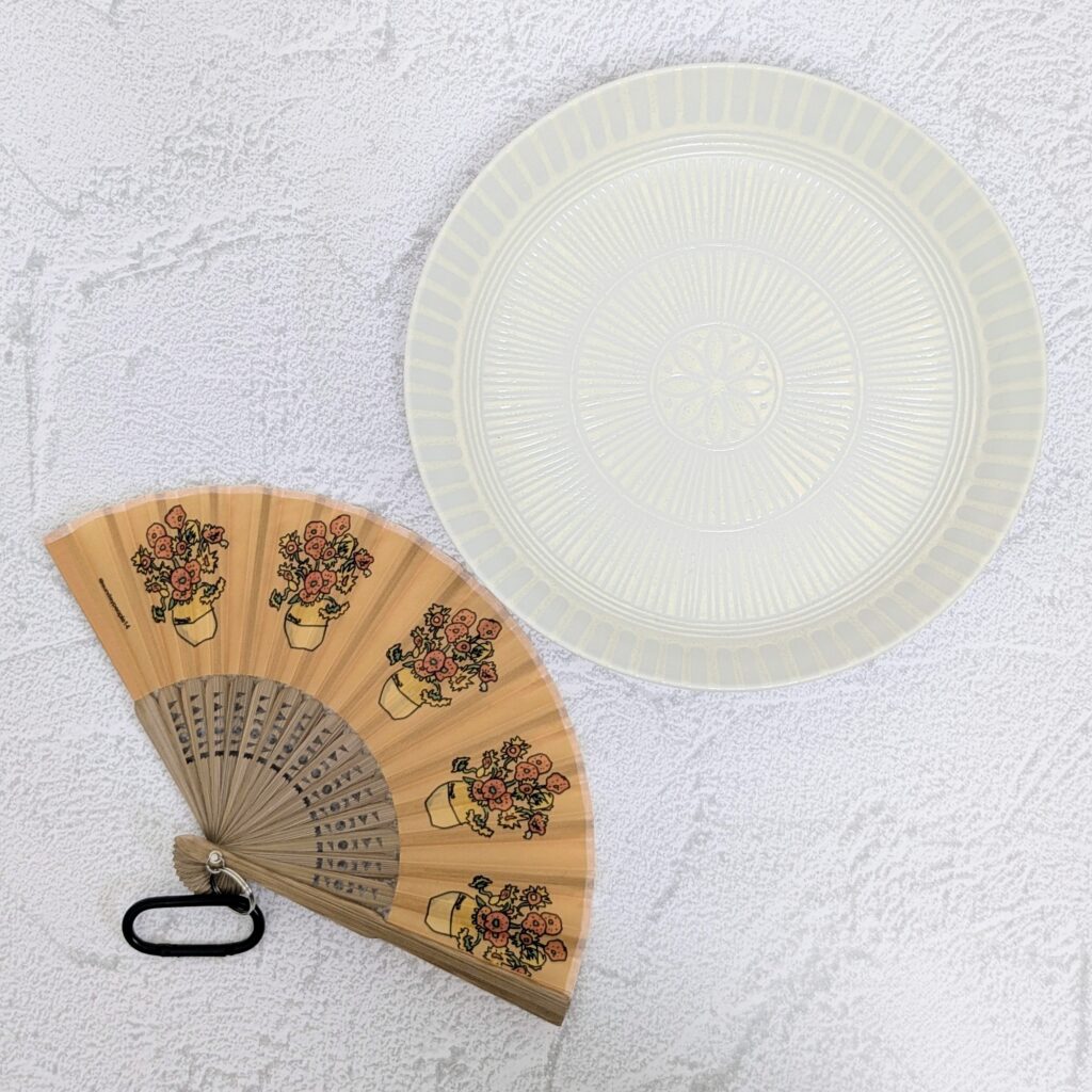 購入したのは、今回の料理を載せたお皿とミニサイズの扇子です。お皿は、放射状のラインがすっきりとしておしゃれなデザインの美濃焼。価格も税込770円で手に取りやすいです。ふちが立ち上がっているので、汁気のある料理を盛りつけるのにぴったり。他のエンタ麺とも合いそうです。