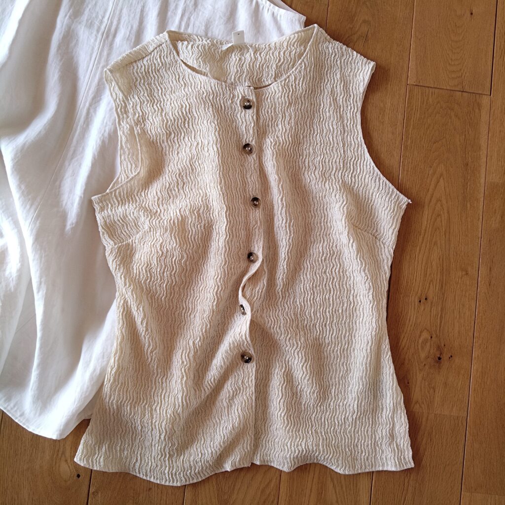 ブラウス未満カットソー以上みたいなこちらは、普段ヘインズのノースリーブばかり着ている身としてシャツ以外の前ボタンがまず新鮮◎