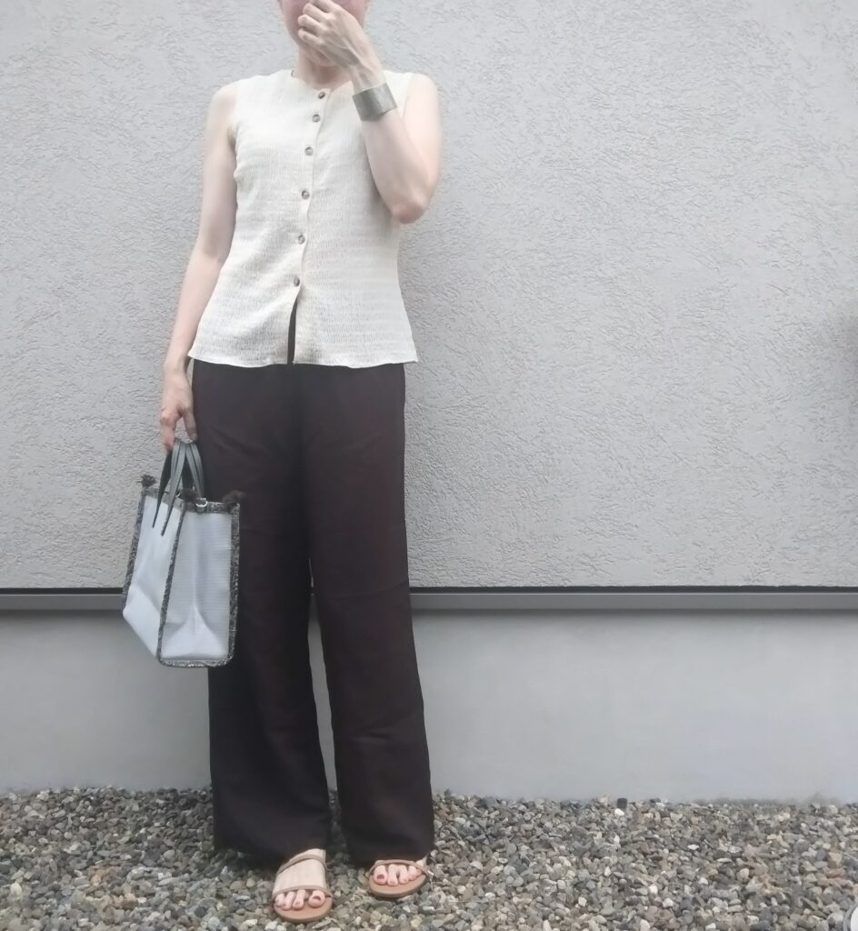 パンツもH&M、リネンブレンドパンツです。これ、ウエストゴムだし薄くて涼しいし超ラクなの~。