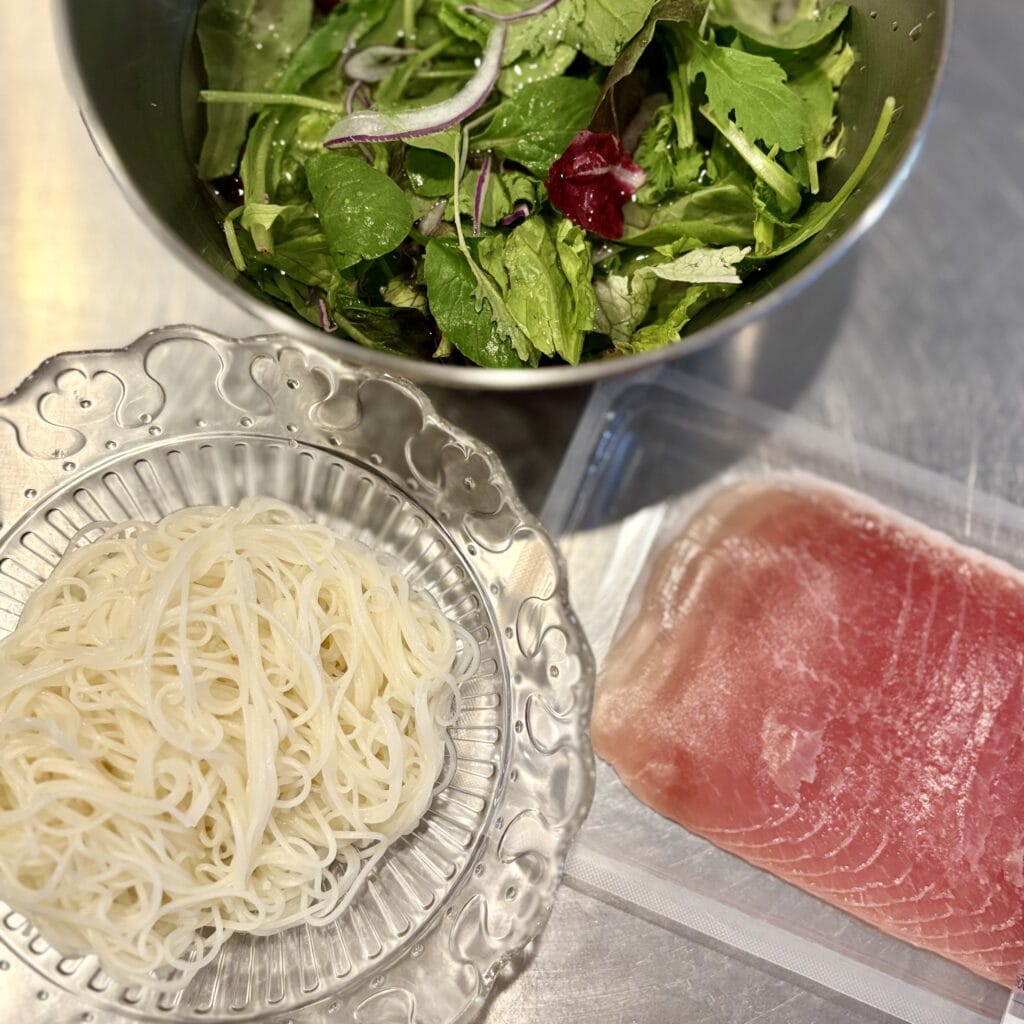 こちら、そうめんの上にレタスや紫玉ねぎ、ベビーリーフ、生ハムを乗せてドレッシング代わりの特製つゆをかけて食べる一品なのですが、野菜を切る時間さえも省略したくなった私は、レタス・紫玉ねぎに関してはカット野菜を活用。ベビーリーフも特にカットする必要はないので、結果包丁いらずのとってもラクチンな一品となりました!