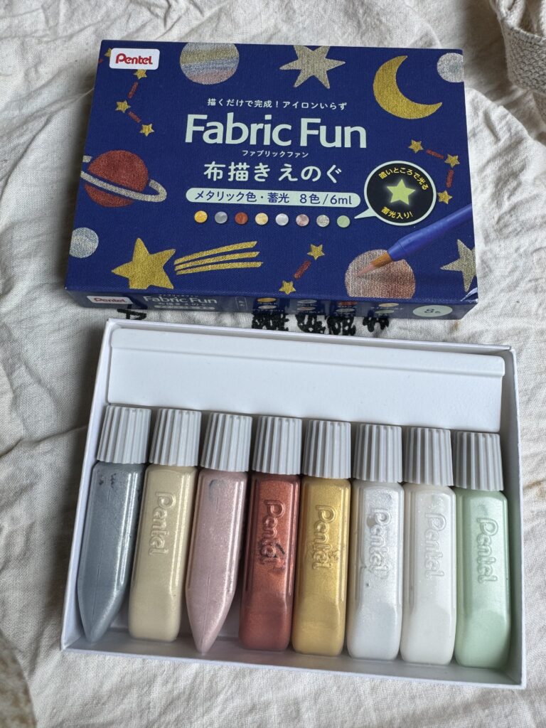 今年は…ペンテルさんから出ているFabric funを。 蛍光色セット基本色セット、そしてメタリックと蓄光絵の具のセットが発売されていました。