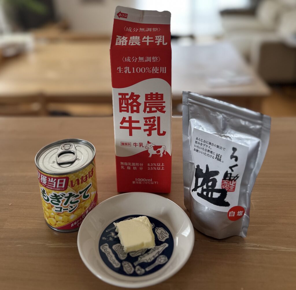 まず最初に作ったのはコーン缶、バター、牛乳、塩の材料4つで作るコーンスープ。