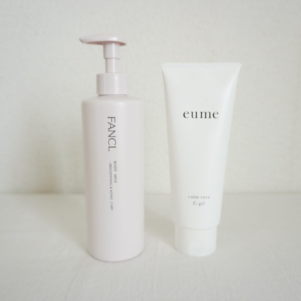 フェイスケアだけではなく、ボディのアフターケアも大切ですね。私は、ファンケル ボディミルク ブランドニング&エイジングケアとイウミーカームベラCジェルでケアをしています。