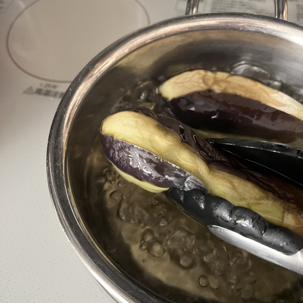 今回は普通のナスを使ったので、ふにゃっとするまで約8分ほど茹でました。