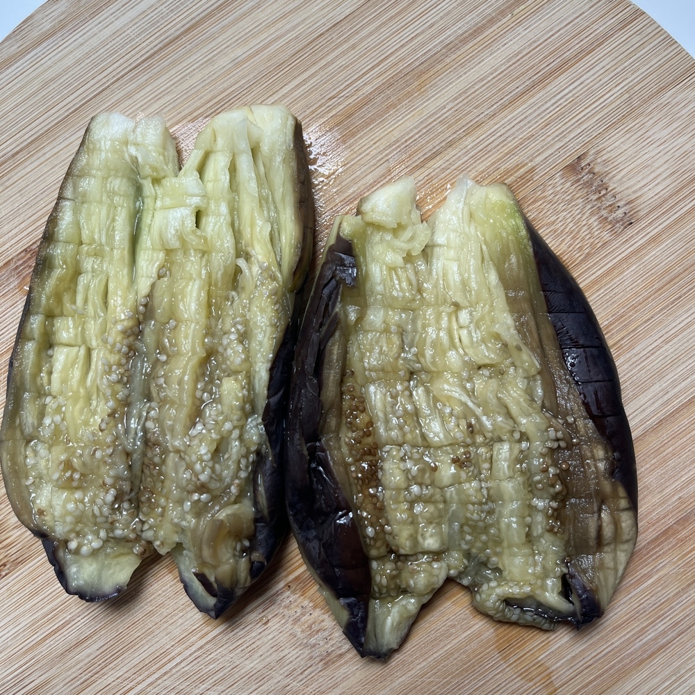 茹で上がったナスを左右に開いて、縦横に細かく切れ目を入れます。