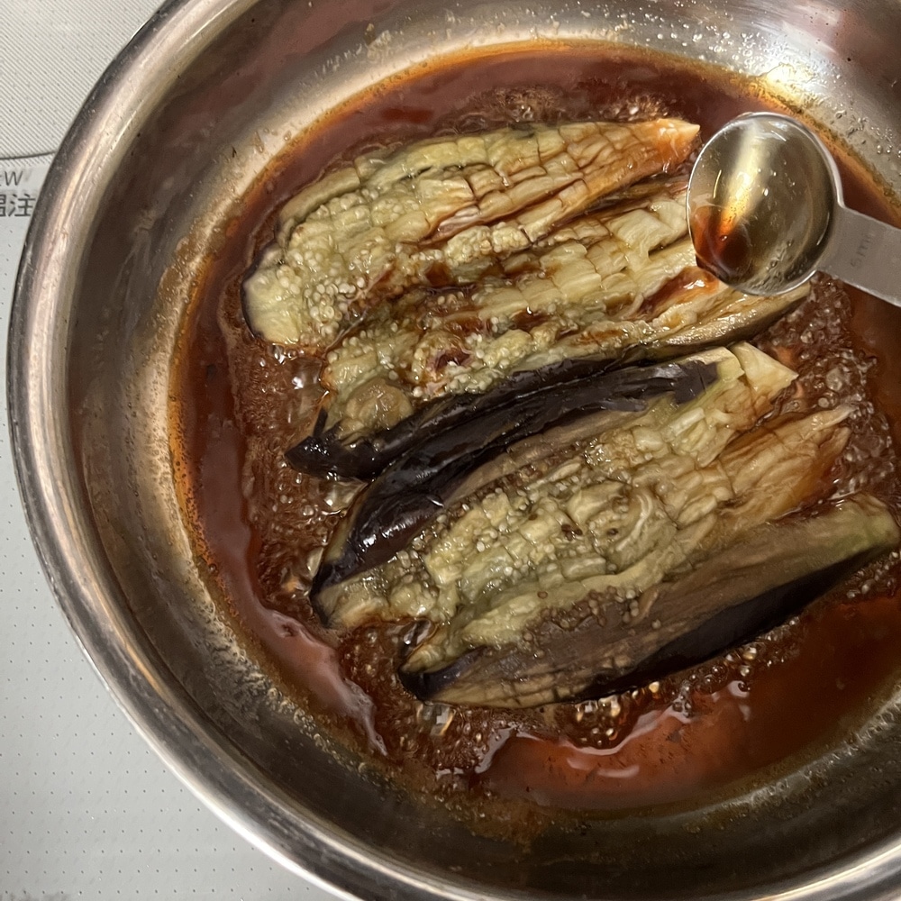 フライパンでタレを作り、ナスを絡めたら完成!!