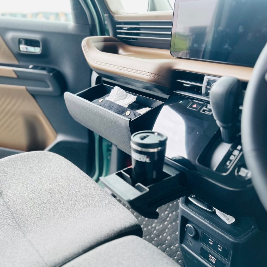 運転席まわりの収納も、ボックスやドリンクホルダー、仕切り等もありスマホを充電しながら立てられたりと、とっても充実。