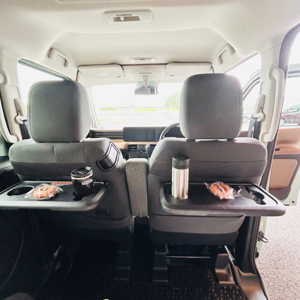 足元も自由に動かせるほど余裕がありますし、手前にテーブルもついているので、ちょっと遠くへお出かけの際ものんびりくつろげます。
