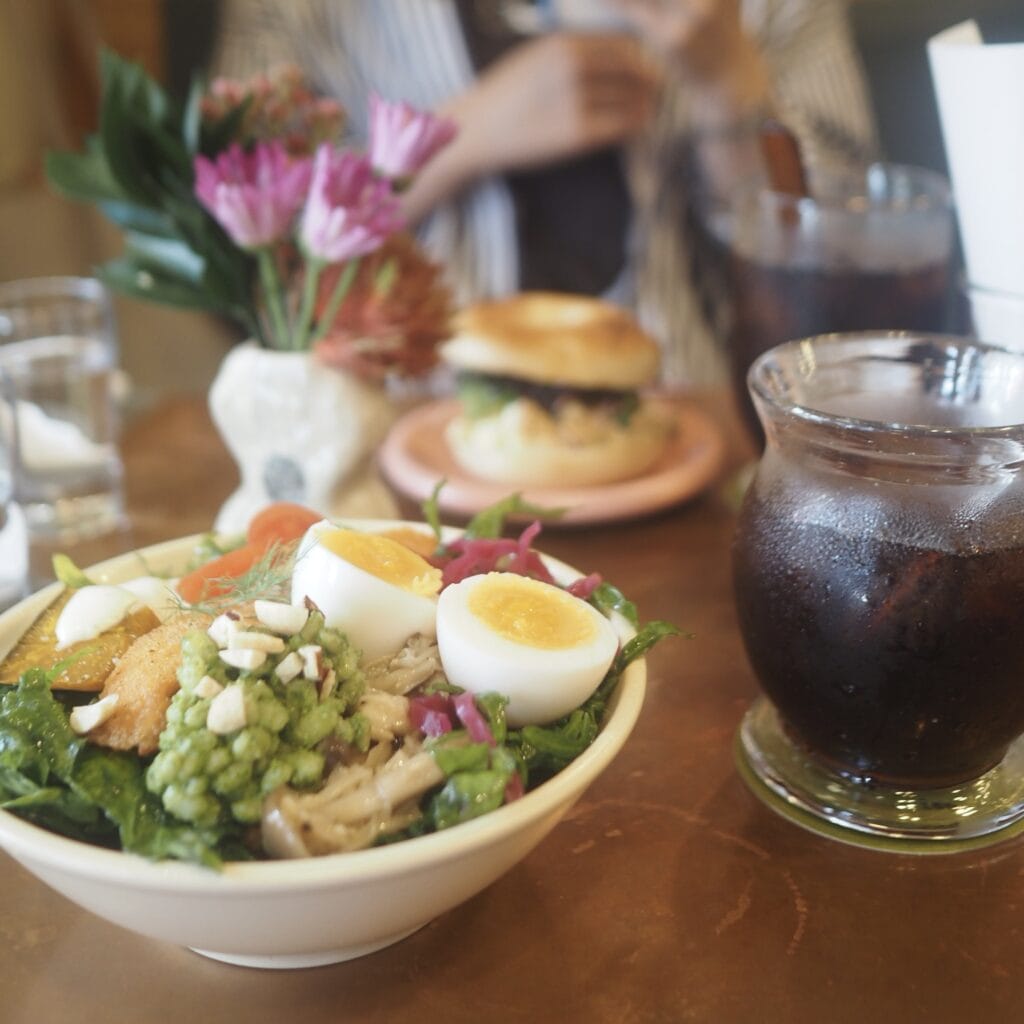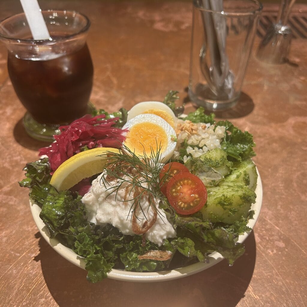 お気に入りメニューはサラダボウル。そのときどきで内容が違うみたいですが、ケールやゆで卵、ビーツあたりはいつも入っているよう。最初は「足りないかも…」と思って食べ始めるんですが、ゆっくり食べているとけっこう満腹になります。体にいいもの食べた!という満足感もあるし、とてもおいしいので味覚の満足感もとてもあります!