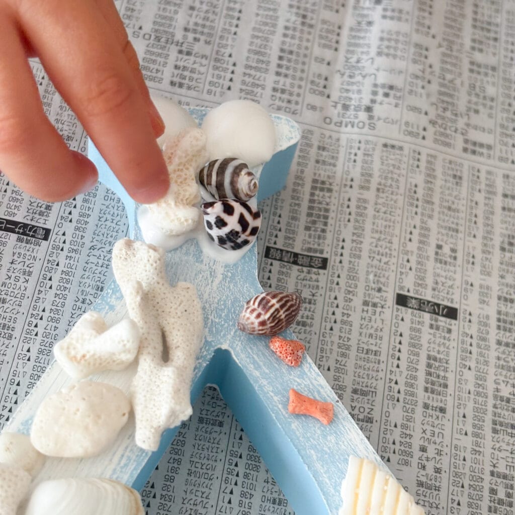 ②どうやって貝殻を貼り付けるか考え中。一面にぎっしり貼り付けるのか、大きい貝をアクセントでつけるのか。迷うけれど楽しい瞬間です。
