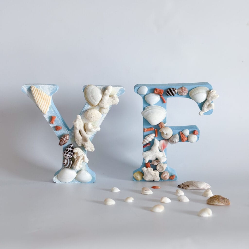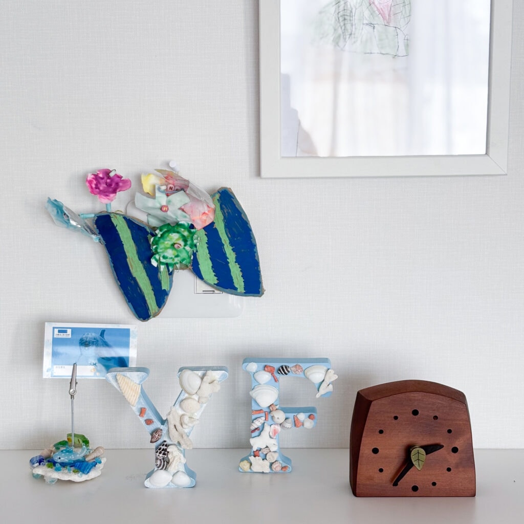 左側のYは私が作ったもの。バランスを考えて貝殻を貼りました。その分ちょっと作為的かも。右側の娘が作ったFは楽しい思い出がぎゅっと詰まっている感じがします。ただ貼るだけですが個性がでますね。