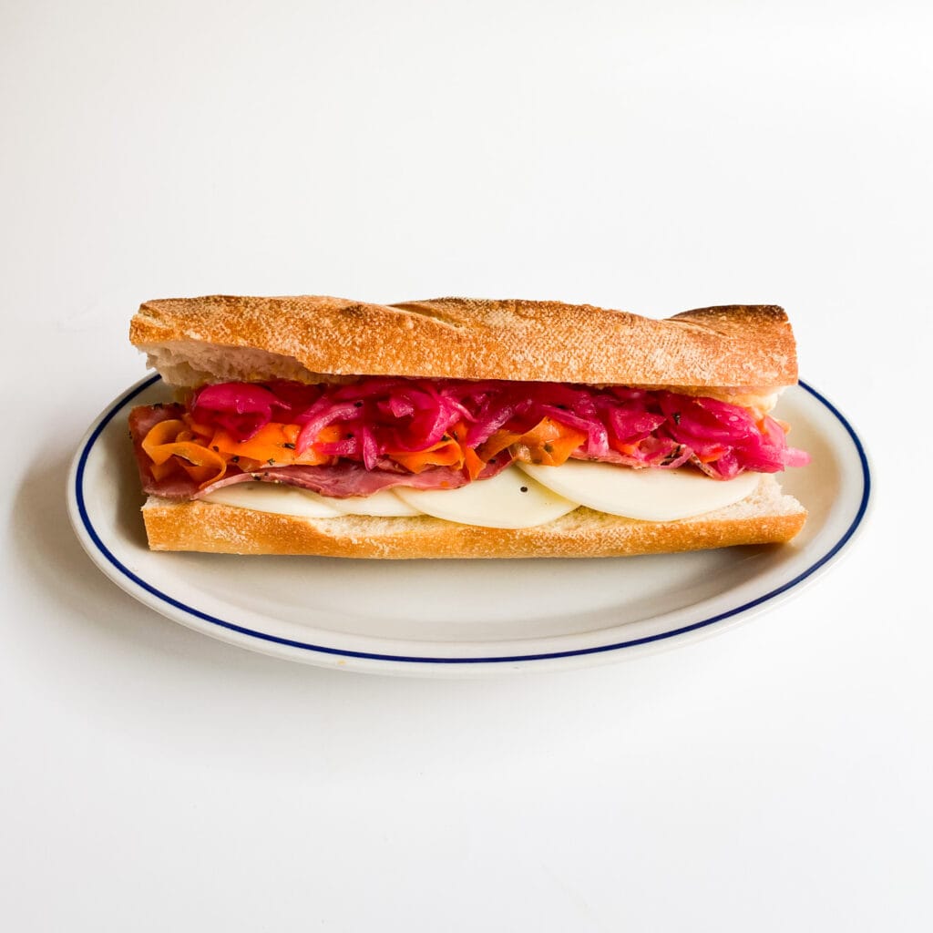 コストコで購入したパストラミに、常備菜のキャロットラペと紫玉ねぎラペをはさんでが彩りよく。